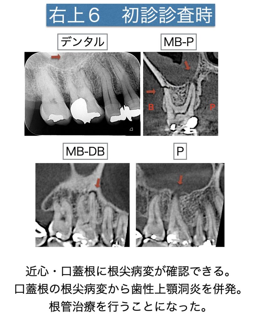 左下の奥歯に関しては、歯周病との合併・全身疾患・治療の成功率のも考慮し、抜歯をおすすめし専門の医療機関へ紹介状を出すことになりましたが、歯性上顎洞炎と診断されおりました右上の歯について診査診断をしましたところ、右上6の近心頬側根と口蓋根に根尖病変ができており、口蓋根の病変は上顎洞への交通が確認できました。