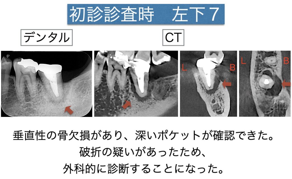 CT上では左下7に頬側歯頚部〜根尖に至るまでの病変が確認でき、病気の形から破折が強く疑われました。