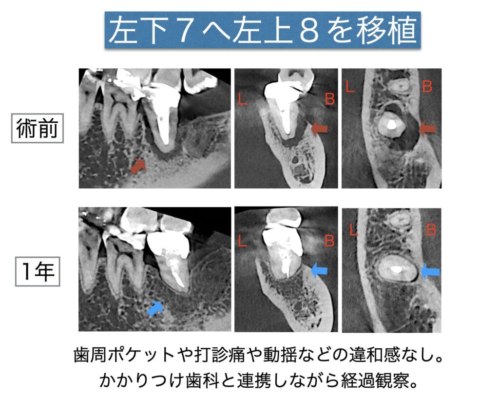 移植歯の歯根膜がそこまでなかったため、歯根膜の位置までしか骨が回復されず支えとしては若干の不安はありますが、頬側は十分な骨の回復がみられ、術後すぐの時点から違和感や動揺はなく経過しておりました。