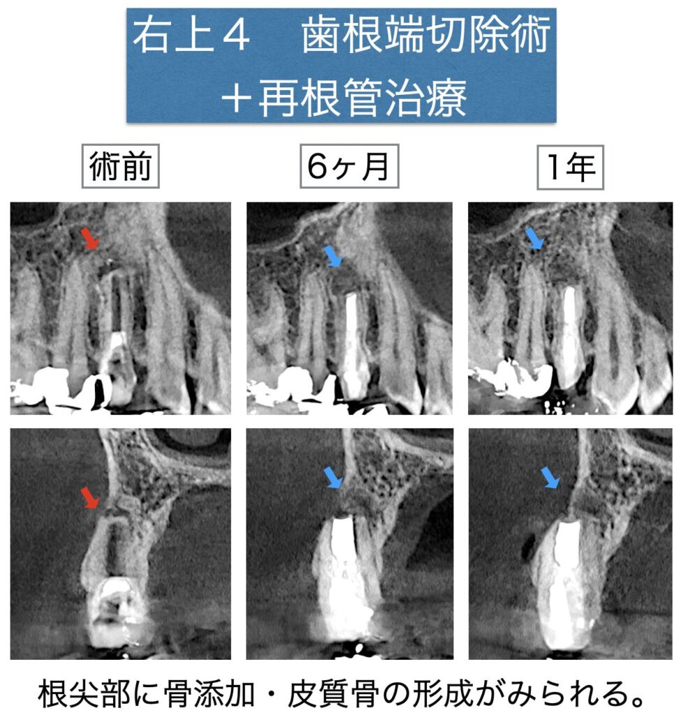 などの治療方針について、メリットデメリットをご説明したところ、③の歯根端切除術→再根管治療をご希望されました。